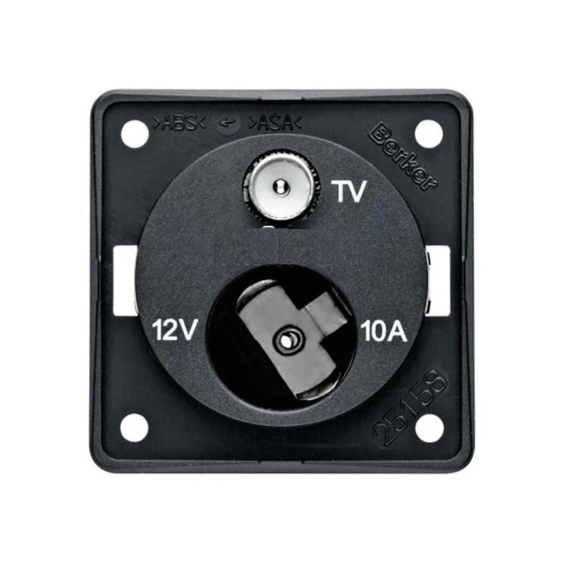Fiche à encastrer, prise 12V type allume cigare avec prise TV classique à encastrer pour l’équipement intérieur des camping-cars et fourgons aménagés.