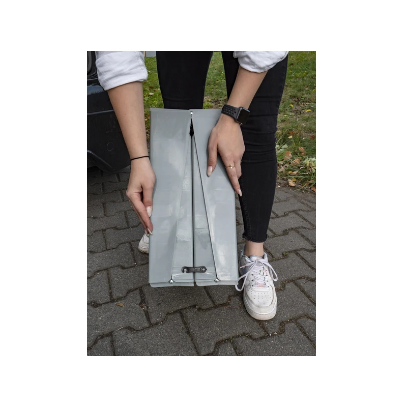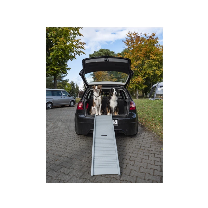 La rampe Emma de chez CAMP4 est un accessoire pliable et compact qui se dispose dans votre coffre ou dans votre hayon de van pour faciliter la descente de votre chien vers l’extérieur.