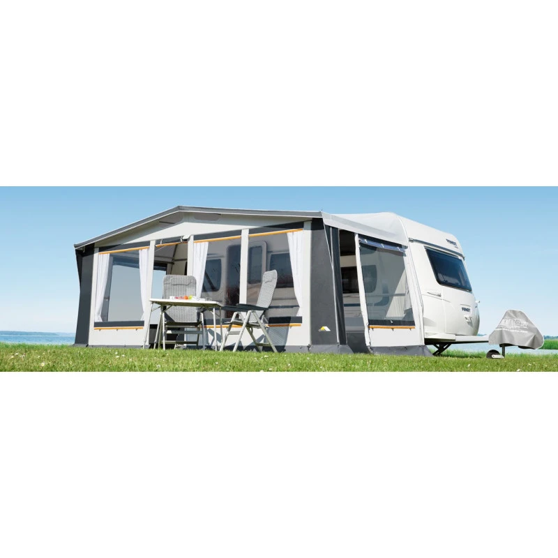 Cet auvent proposé dans les tons gris et blanc est destiné à un usage intensif peu importe la saison. Réalisé en toile polyester de haute qualité plastifiée sur les 2 côtés, cette toile est résistante au vent et au soleil. Les aérations peuvent être refermées et les rideaux peuvent être tirées au niveau des fenêtres pour préserver une certaine intimité lorsque vous vous trouvez sous votre auvent.