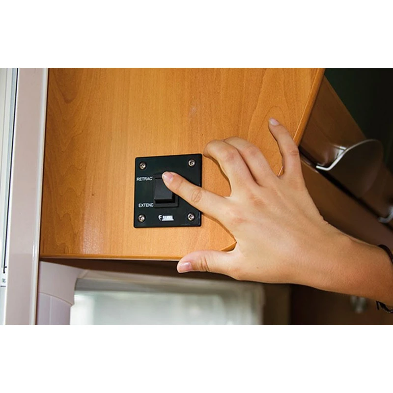 Grand store de paroi pour camping-car à déploiement électrique 12V, le FIAMMA F45 Eagle 450 Polar White est mis en place simpelement en appuyant sur un bouton !