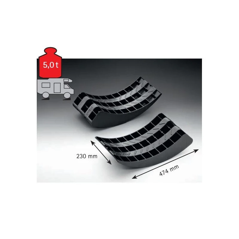 FROLI spécialiste de l’accessoire camping-car propose ici sa paire de cales roues arrondi standard, ce système simple et rapide permet la mise à niveau de votre véhicule en effectuant une simple marche arrière progressive, pour une élévation jusqu’à 10 cm.