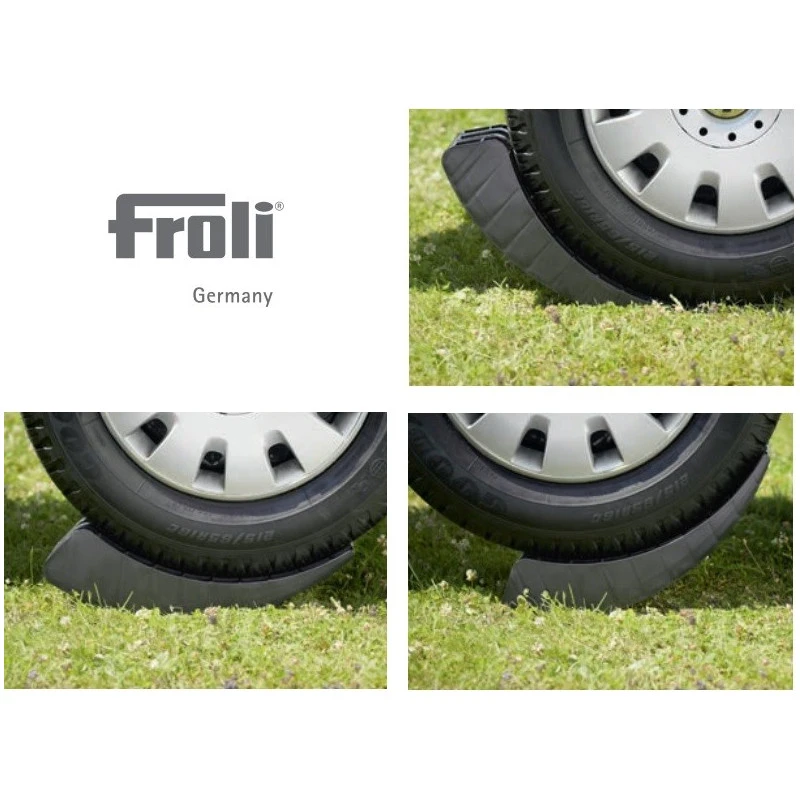 Système de mise à niveau automatique pour camping-car et fourgon aménagé, paire de cales roues FROLI arrondi standard pour calage rapide.