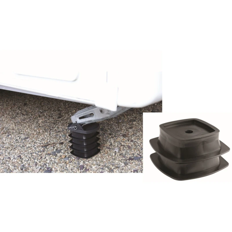 Jeu de 4 cales HTD empilables à poser sous les vérins stabilisateurs des camping-cars ou caravanes, accessoire on-ne-peut plus pratique pour la mise à niveau.