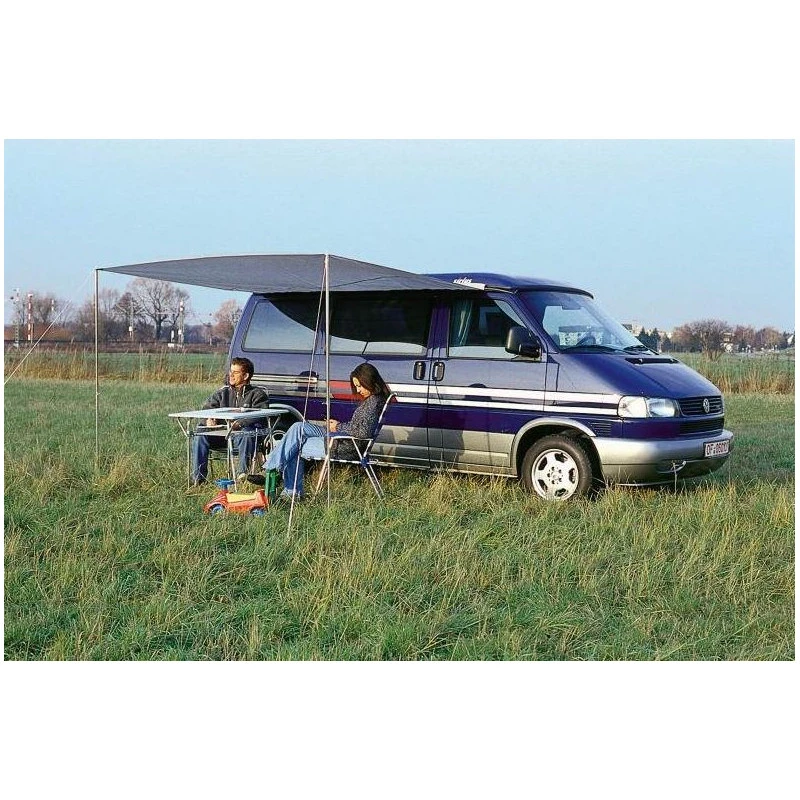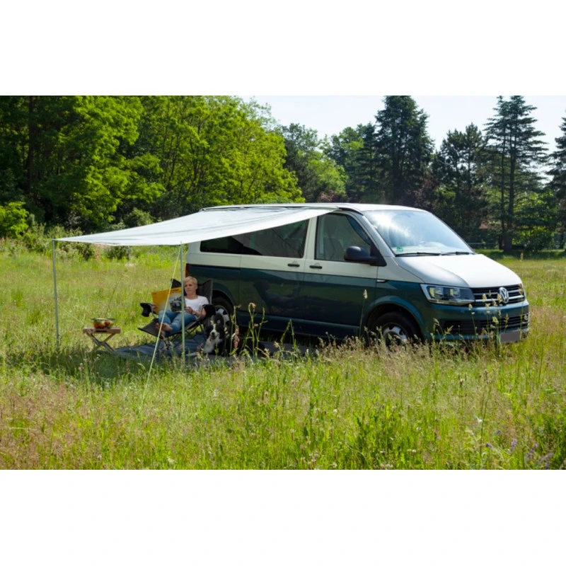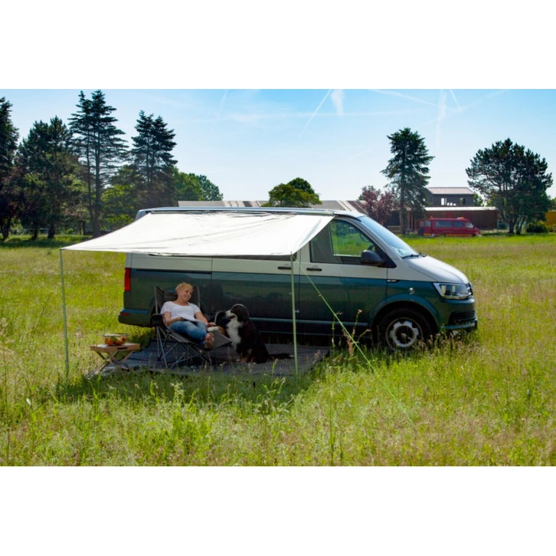 Le Charly de REIMO est une toile d’ombrage, un auvent léger pour les fourgons et vans aménagés en camping-car ou caravane. Facile à installer, il fait 255 x 240 cm et fait office de solette un fois en place.