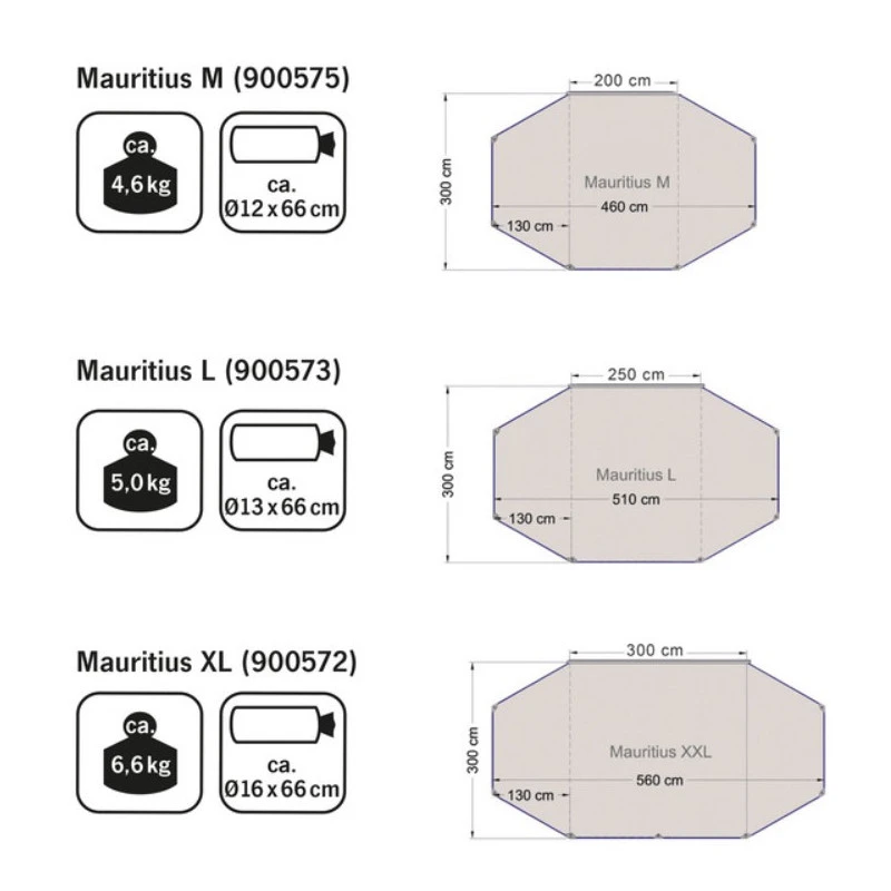 Le Mauritius est fabriqué en toile polyester RipStop 300D et vous protègera parfaitement bien des UV mais aussi des averses.