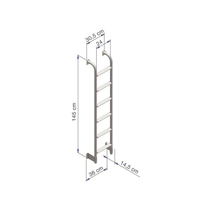 Equipement pour camping-car de qualité de fabrication THULE, cette échelle s’installe à l’arrière sur la paroi des camping-cars ou fourgons aménagés. Très pratique pour ceux qui ont besoins d’accéder rapidement au toit si par exemple un coffre de rangement y est installé. Avec sa hauteur de 145 cm et ses 6 marches, il permet de se « hisser » assez haut.
